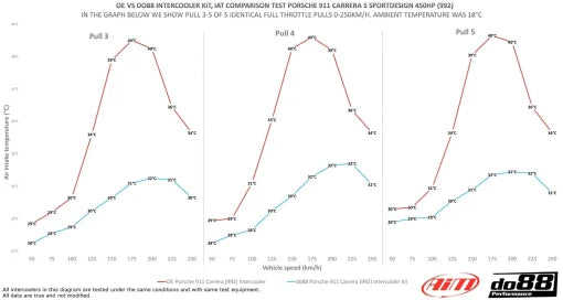 Firstly, 4 runs were made with the car equipped with the 992 OE intercoolers. Stop, fast change of parts to the do88 intercoolers. Shakedown for a few minutes and then five runs made in the exact same way as with the OE parts. The decrease in inlet air temperature is significant, peak delta is 12°C (21,6 F).