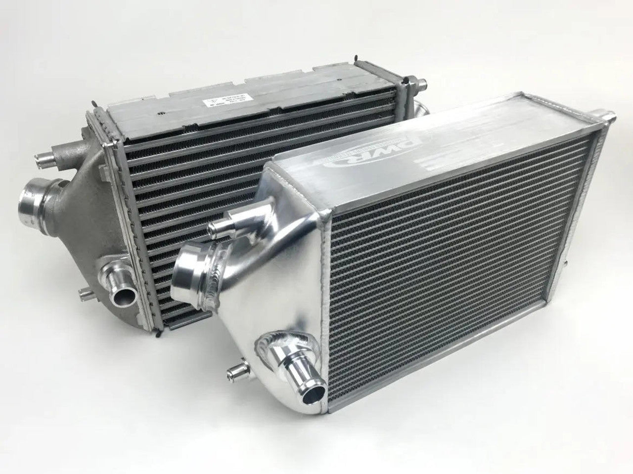 The OEM tube/fin core contains a single row 7mm tall flat edge tube along with a high-efficiency multi-louvered 7mm tall fin. The CSF/PWR high performance 991 GT2 RS intercooler kit contains a 2-row core featuring 3mm tall rolled tubes with turbulated inner fins manually placed inside each tube to maximize the dissipation of heat from the charge air flowing through the pressure side of the intercooler core. The ambient side 4.85mm tall multi-louvered fin is also the most efficient fin in the high-performance industry globally with performance similar to PWR's Formula-1 grade race intercooler cores.
