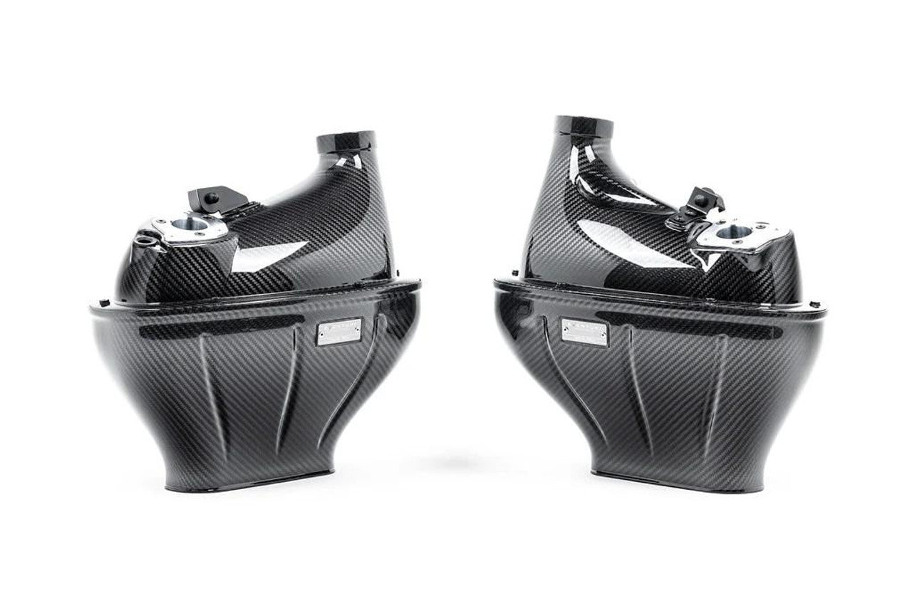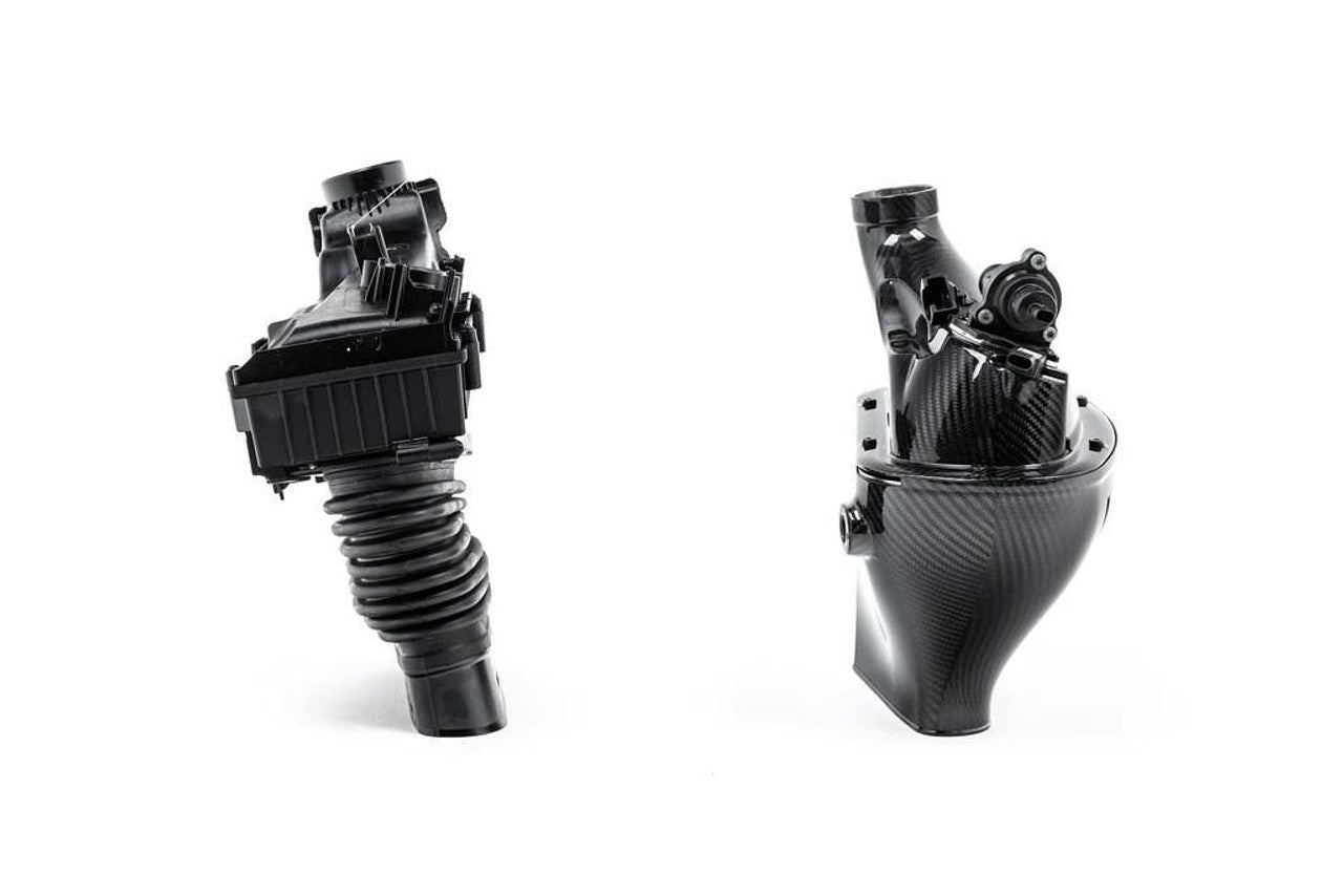 The G63 AMG W463A Eventuri Intake is precision-crafted from prepreg carbon fiber, featuring CNC machined components and custom-designed high-flow filters. This intake sets a new benchmark for performance gains in the aftermarket segment for this platform. By utilizing the additional space under the hood, we have significantly increased the intake volume, achieving an impressive 25% greater airflow rate compared to the OEM airboxes, all while retaining the original cold air feeds.