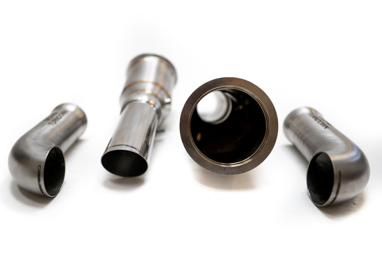 Replace the restrictive OEM ceramic GT2RS 700 cell catalytic converters and OEM Titanium muffler with straight pipes for racing competition off road use only. Save a huge significant amount of weight off your GT2RS and increase sports car sound to Lemans and Daytona 24 hour sound tracks from the Porsche 935 K3 days!