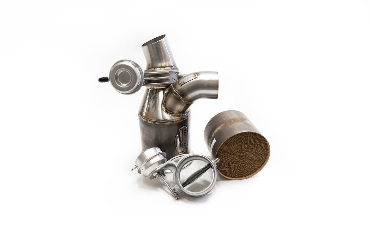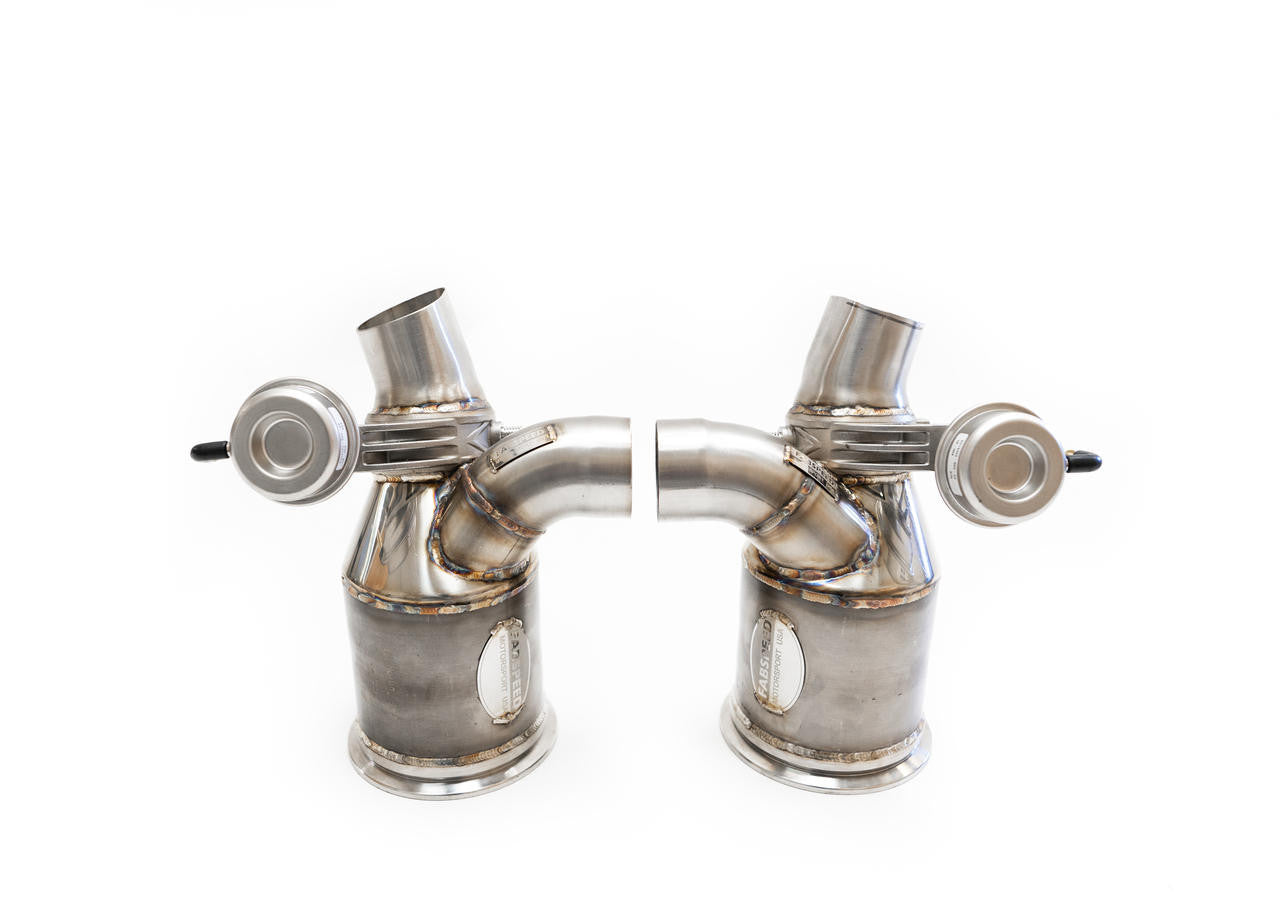 Simple direct replacement bolt on HJS catalytic converters for the ceramic GT2RS cats and bolt-on directly to the titanium GT2RS OEM center muffler. These are the very largest HJS HD German cores that will fit on this car. Guaranteed 92% flow of a straight pipe with no Check Engine lights and NO ECU tune required. Fabspeed also uses Helical U.K. imported 3.0" 76mm vacuum actuated exhaust valves. Helical LTD. Aerospace England supplies these ultra high temperature Inconel 625 stainless steel valves to Porsche, Ferrari, Mclaren, Aston Martin as OEM due to bulletproof reliability. If it's NOT engraved with Helical on top it will fail, rattle or melt internally. If its not a Helical exhaust valve it will not work. DO NOT put any brand of exhaust on YOUR CAR UNLESS it says HELICAL U.K. - virtually everything being sold is 100% Chinese Guaranteed to FAIL alibaba $45 cheap junk exhaust valves - that will rattle, break or set off fault codes and CAN NOT Be fixed. SERIOUSLY- if you contemplating a purchase DEMAND Helical U.K. aerospace exhaust valves!