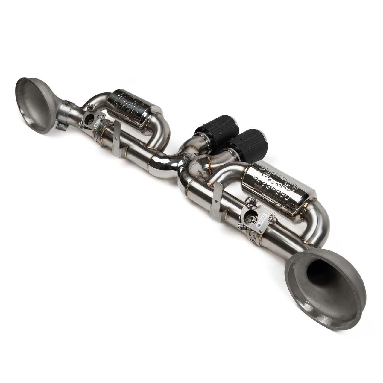 The Fabspeed Motorsport Valvetronic Nordschleife Cat-Back Exhaust System gives the 992 GT3/ GT3RS a truly exotic sports car sound, all while retaining the functionality of PSE, Porsche Sport Exhaust valvetronic push button system. Our design process started with 3D laser scanning the entire OEM exhaust system and underside of the GT3 flat 6 engine using our CREAFORM 700 Handscan so that we could make a complete Solidworks 3D model of the exhaust. We then CAD designed the exhaust and fixtures using that model so that the exhaust fit perfectly to OEM Porsche Motorsport standards. After multiple revisions for Sound Quality and ACTUAL incremental dyno testing we decided to use our signature cast 70mm 2.75" X-Pipe to tie the two Flat-Six cylinder banks together for exhaust scavenging and to defeat resonance. The exhaust valves are made by Helical Limited in the United Kingdom. These are the WORLD's finest Aerospace quality exhaust valves. Helical ISO 9001 certified valves are the same ones Ferrari, McLaren, Pagani, Aston Martin, Koeniggseeg, and Porsche use on their GT cars. Fabspeed's exhaust systems are mandrel bent in-house from T304 Stainless steel, and you have five different tip options to choose from. This 992 GT3 systems is 100% GUARANTEED to make the Worlds Very best sports car sound and MORE power than any other system in the WORLD! Ultimate quality bullet-proof exhaust valves and an X pipe linking both exhaust banks of the FLAT 6 required real true engineering versus simply slapping together two 90 degree straight pipes like many other companies or utilizing 3" tubing 100% guaranteed to make less horsepower and torque versus Fabspeed.