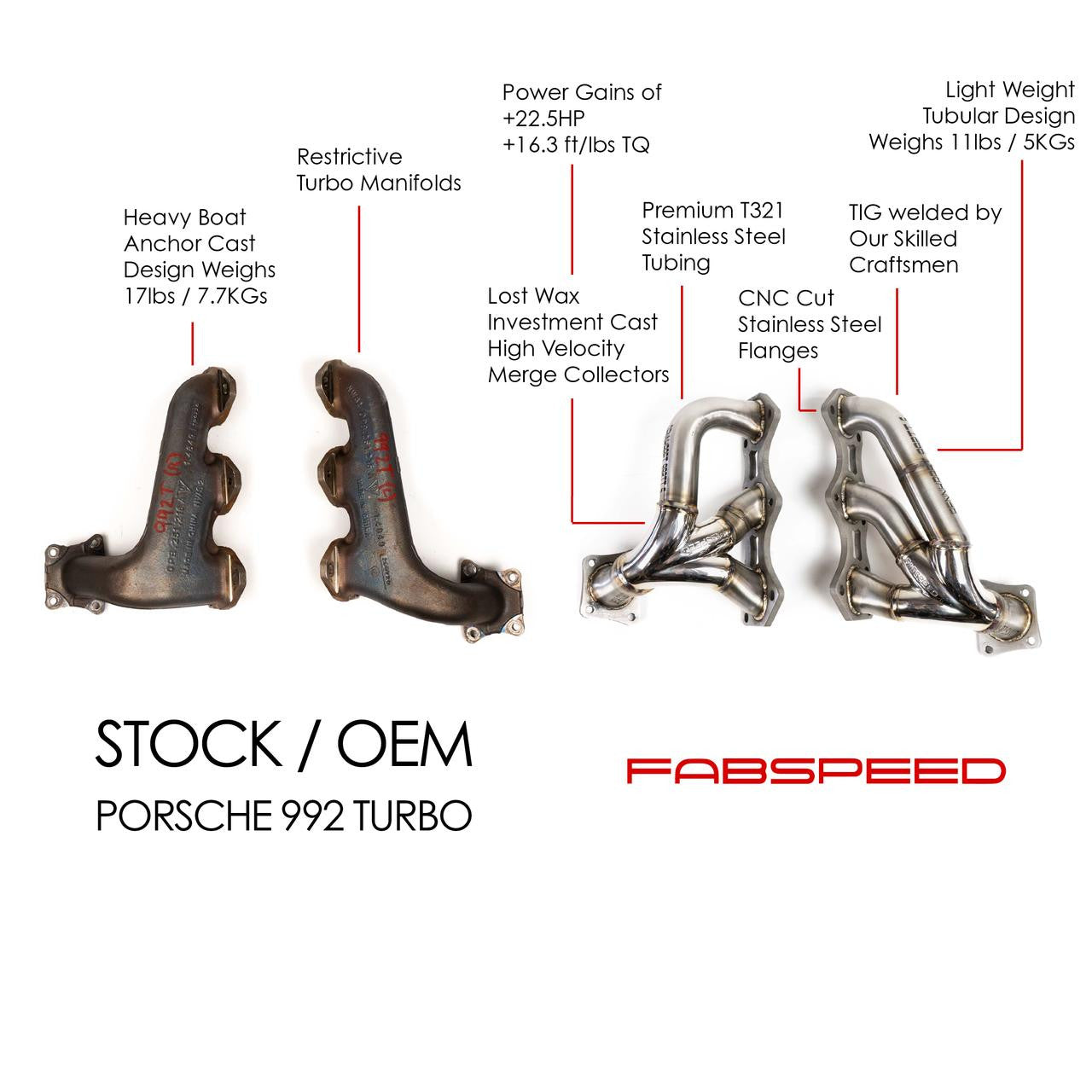Fabspeed Motorsport Sport Headers for the 992 Twin Turbo / 992 Twin Turbo S are a perfect start or finish to anyone looking for maximum emissions legal performance, tone, and sports car sound out of their High-performance missile on 4 wheels. Given the wild reputation of the original 911 Turbo, its jet-speed and sure-footed handling coupled with any Fabspeed Motorsport aftermarket exhaust just feels like “the right thing to do”. Saves weight over the heavy cast steel headers.