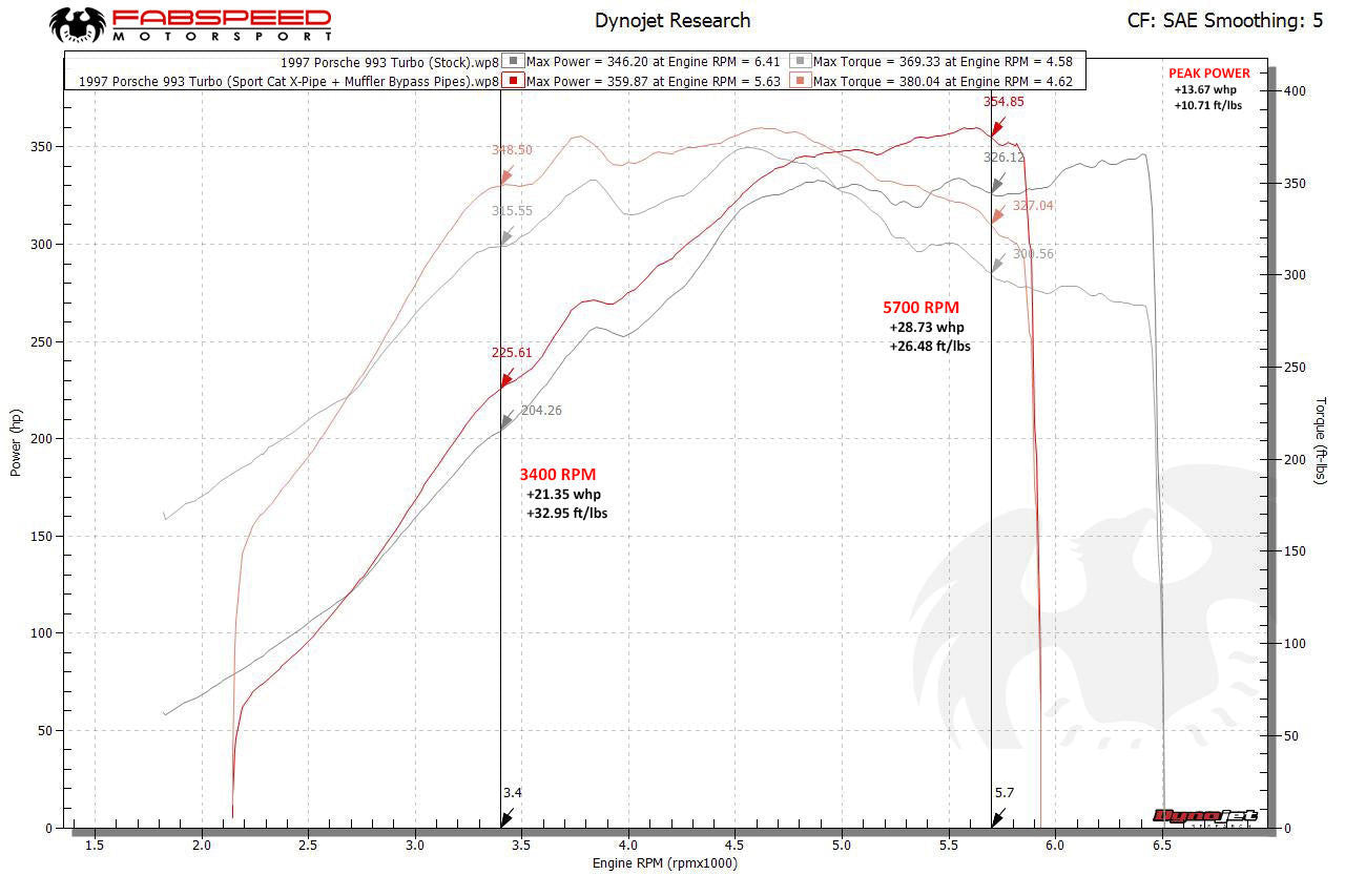 Fabspeed's Sport Cat X-Pipe (in conjunction with our Muffler Bypass Pipes ) provides maximum gains of over 28 wheel horsepower, 34HP to the crank, and 26 ft-lbs of torque at 5700 RPM. Peak power surges by 13 whp and 11 ft-lbs to 360 whp and 380 ft-lbs of torque.