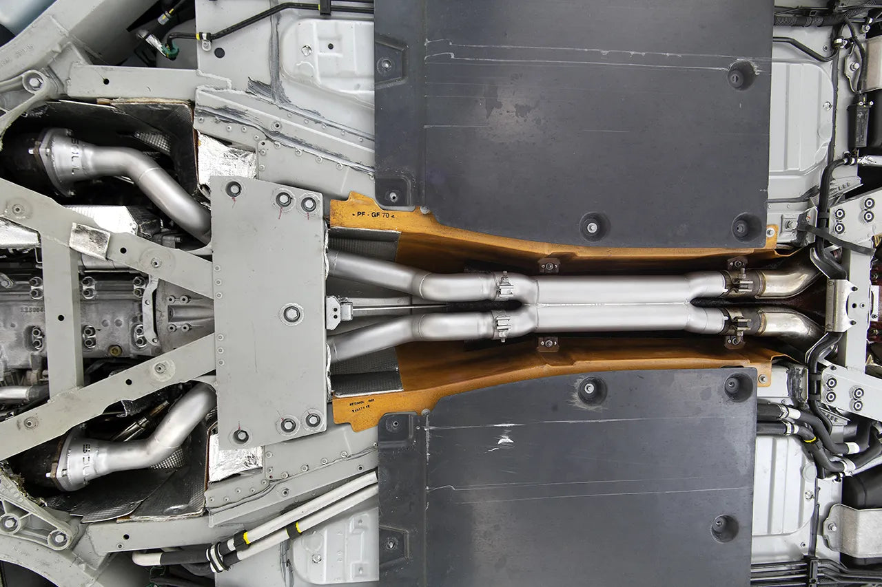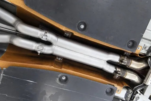 Replacing the factory Ferrari FF midpipe with an x-chamber slightly reduces droning while encouraging a smoother exhaust note.