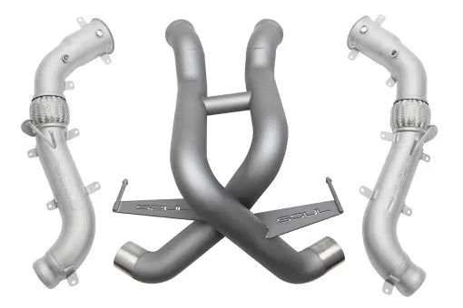 DEVELOPMENT: We like McLarens – but we LOVE aggressively modded McLarens. Our goal was to make a full exhaust that would yield the most power, sound, and best possible experience out of McLaren ownership. We based our custom McLaren downpipes around 3.5″ piping for the best possible sound and support for increased horsepower. If you plan on tuning the vehicle or running upgrade turbos our downpipes are designed to support anything you can throw at them. We made a conscious decision to retain the factory McLaren heat shields for their proven effectiveness and a clean, factory-like installation and finish. The rear exhaust unlocks extra exhaust flow while improving sound quality in as simple a design as possible. For this twin turbo application we incorporated an H pipe / talk tube which helps to smooth out the exhaust note for a more refined sounding exhaust. Cross over piping design cuts down on rasp and resonance, especially on catless cars.