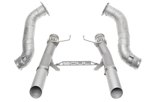 The factory downpipe to exhaust flange necks down at 2.75″, choking potential power and volume. Soul Performance Products has crafted a full catless downpipe and rear exhaust solution that is full, unrestricted 3.5″ piping from downpipes to tips for maximum performance. Extreme durability OEM-like heat shields keep underhood temps down for heat protection and exhaust velocity up for maximum power.