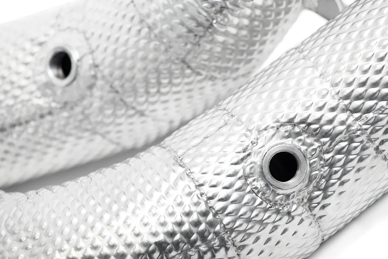 CONSTRUCTION:  Each downpipe is built in house out of mandrel bent, thick wall .065″” T304L stainless steel, then rigorously quality checked. Back purged TIG welding ensures proper weld penetration and longevity. HeaderShield™ metal shields are professionally applied for a form fitting and life long lasting heat solution.