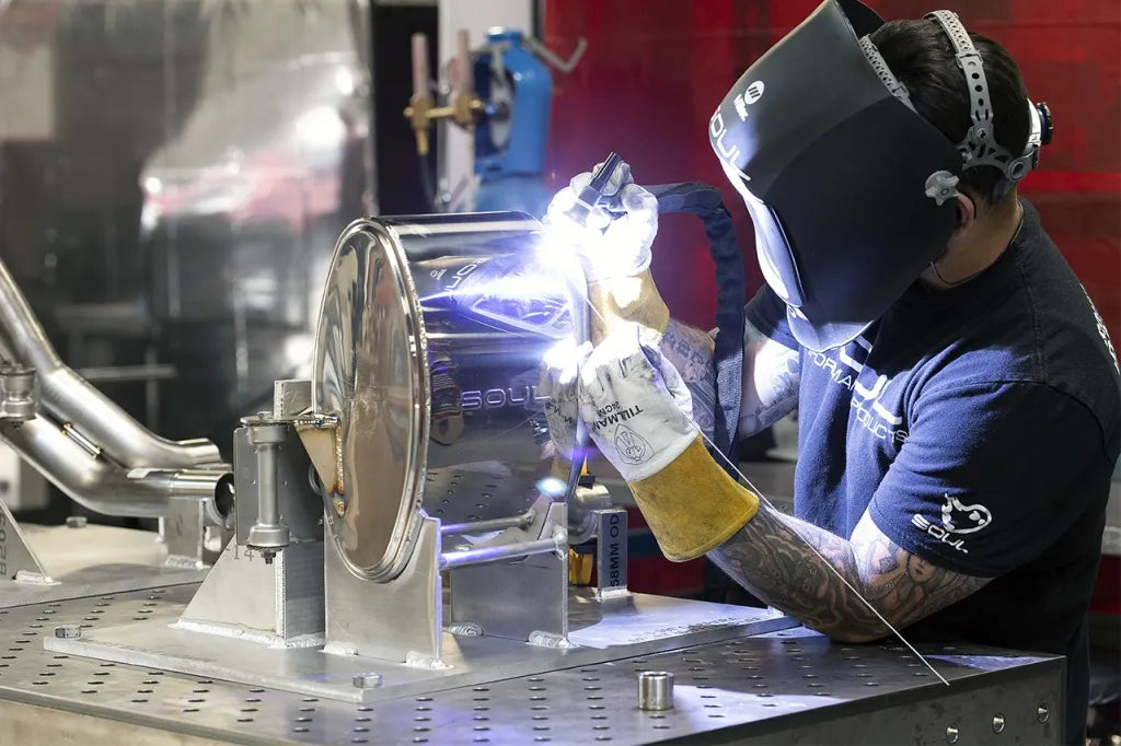 CONSTRUCTION: Each system is made in-house by our fabrication team from mandrel bent .065″ wall, 2.25″ diameter T304L stainless steel tubing, bespoke SOUL mufflers, and laser cut brackets. Back purged TIG welding (with ARCAL™ Prime argon gas) ensures proper weld penetration and longevity – crucial for durability on the track.