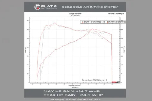 The Flat 6 Motorsports Cold Air Intake System is the most advanced engineered intake system available for the facelifted 95B.2 Porsche Macan. Aided by CFD analysis, Flat 6 optimized the intake air flow, providing a maximum power increase. The open top ducts paired with the bell-horn shape and proprietary filter media creates an optimum surface to distribute air inside the factory airbox to maximize air velocity and flow. This cold air intake system integrates directly to the factory airbox enabling a simple installation and OEM fit & finish.