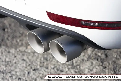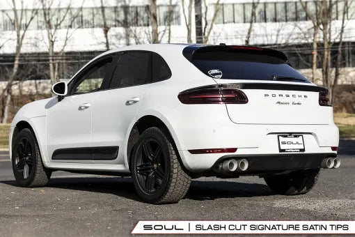 DEVELOPMENT: The Macan is quite refined with generous sound deadening and heavy muffling in the exhaust. Evaluation of the factory midpipes reveals a very high flowing and relatively smooth flowing design. Porsche incorporated a factory break point and the rear section is what holds the exhaust back. The SOUL Resonated Muffler Bypass Exhaust forgoes the factory mufflers for a clamp on, 2.5″ straight pipe design with the addition of race resonators to minimize drone. The straight through design of our race resonators encourages maximum power and sound under heavy throttle while cutting down on harsh frequencies that can make their way into the cabin and cause droning on partial throttle and during cruising conditions. This is the ideal solution to pair with an aftermarket downpipe to prevent drone and raspiness. The Y pipe setup exiting out through quad tips encourages equal exhaust distribution and tip adjustability to allow for either a flush or staggered appearance in the bumper.